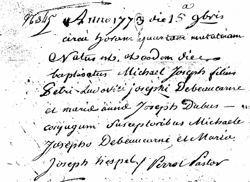 Le couple BEAUCARNE-DUBUS eut 2 garçons : l’aîné, Jean-Batiste BEAUCARNE, probablement décédé très jeune et Michel-Joseph BEAUCARNE. On remarque sur le registre des baptêmes qu’on a ajouté la particule « de » devant « beaucarne » !