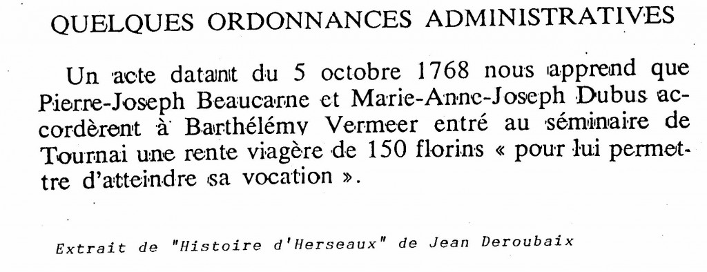 Nous retrouvons trace du couple BEAUCARNE-DUBUS dans le livre « Histoire d’Herseaux » de Jean DEROUBAIX :