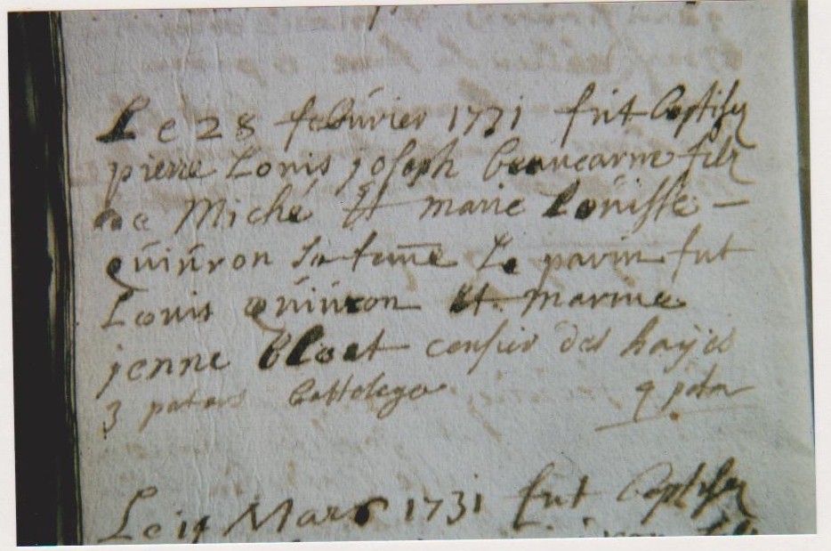 L’an 1758, le 1er du mois d’août, par devant le Révérend vicaire, mandaté par nous à cet effet, se sont unis par les liens du mariage Pierre Joseph Beaucarne et Marie Anne Dubus, tous deux de cette paroisse, après publication d’un seul ban de mariage, la dispense des deux autres ayant été obtenue de la part du Révérend Monsieur De Coninck vicaire général de l’Evêque. Toutes les formalités ayant été respectées, en présence de Jean-Baptiste Carette et de M. Françoise Joseph Beaucarne. (témoins)