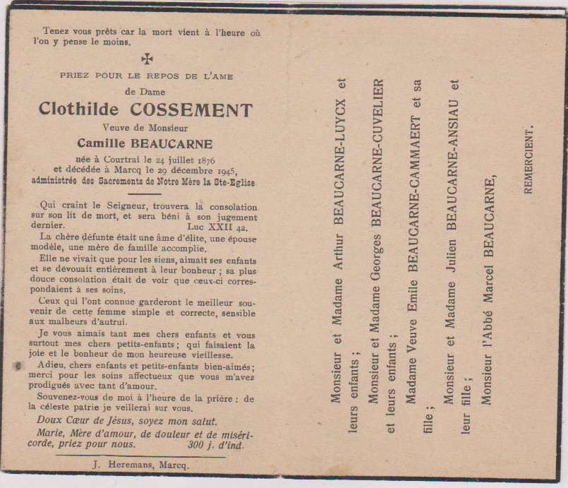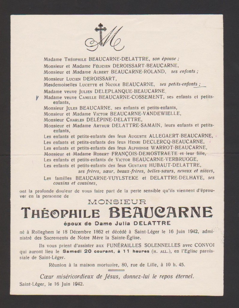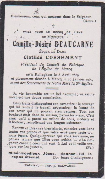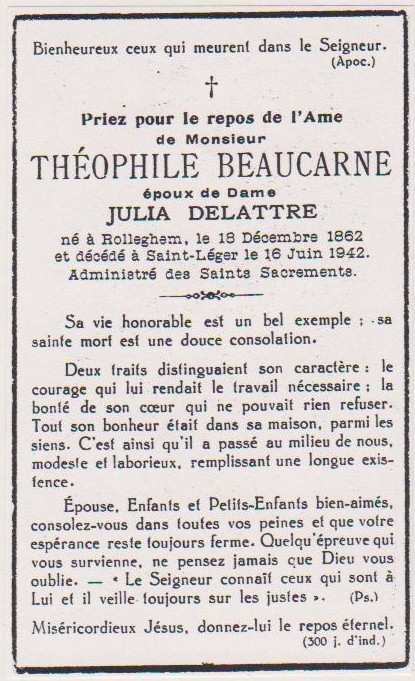 Ont eu 6 enfants : Georges (mon grand-père, père de mon oncle Marcel , de marraine Irène et de mon père Georges BEAUCARNE), Hilaire, Germain, Jérôme, Gérard, Marcel.